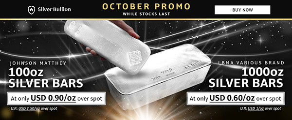 - 1000 oz Silver Bars for only USD 0.60/oz over spot (40% off the premium over spot)