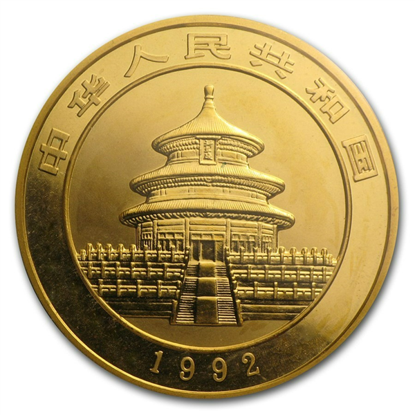 The 1992 100 Yuan 1 Troy oz Small Date Gold Panda features the image of a young Panda climbing in the treetops. Like many Pandas from this decade, the 1992 gold Small Date Gold Panda is considered a very uncommon bullion coin. There are two main varieties of the 1992 Gold Pandas: Large Date and Small Date. The small date coins were struck at the Shenyang Mint while the larger dated coins were struck at the Shanghai Mint The place most likely to show wear or rub is the Panda’s head and torso. With the exception of naturally occurring red spots, the 1992 Small Date Pandas are usually well-struck and extremely attractive. The highest grade known so far is MS-69.